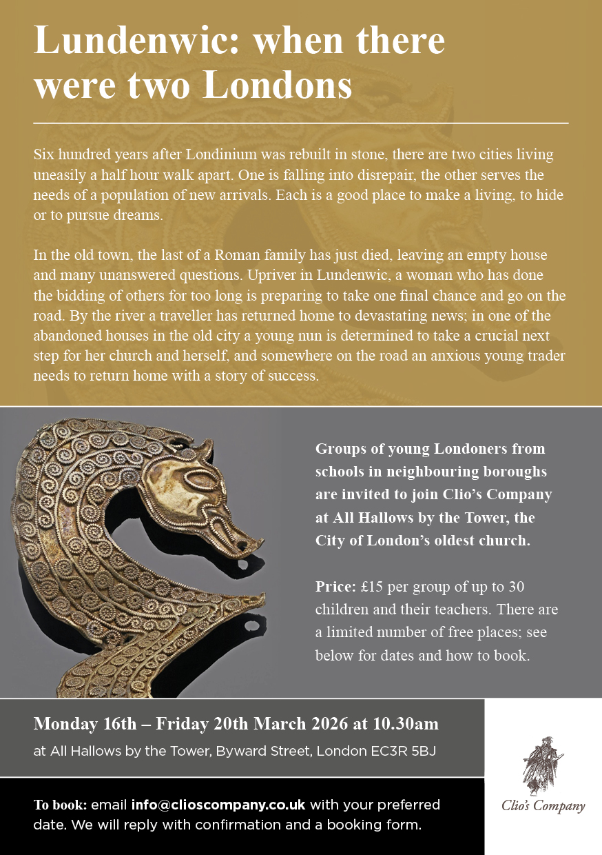 Shoddy workmanship, coins counterfeited to pay for – what?, a trophy wife at war with her half forgotten past, an army officer made vulnerable by nostalgia for his grandfather’s Britannia – all among the tricksters, building sites and military patrols of a town the Romans are rebuilding in stone. This is a world where the head of the civil service is a slave and newcomers from all over the Roman Empire have arrived to try to make a fortune. But not everyone wants to be a Roman citizen. Clio’s Company leave you with a cliffhanger. Bring your group to help decide what happened next at All Hallows by the Tower in November.